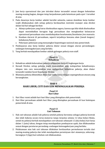 Peraturan Perusahaan PT. Benih Citra Asia| Halaman 72.Jam kerja operasional danjam istirahat diatur tersendiri sesuai dengan kebutuhan masing-masing bagian, dengan tetap berpedoman pada ketentuan pada ayat 1 tersebut diatas.3.Pada dasarnya kerja lembur adalah bersifat sukarela, namun demikian kerja lembur wajib dilaksanakan oleh setiap pekerja berdasarkan instruksimanajer atau direksidalam hal-hal sebagai berikut:a.Adanya pekerjaanyang harus diselesaikan segera, karena apa bila tidak diselesaikan dapat menimbulkan kerugian bagi perusahaan dan menghambat kelancaran operasional perusahaan atau membahayakan keselamatan/kesehatan jiwa manusia.b.Keadaan darurat di perusahaan, seperti terjadinya bencana alam (tanah longsor/ kebakaran/banjir).c.Pekerjaan-pekerjaan yang menyangkut kepentingan nasional atau pemerintah.4.Pembayaran atas kerja lembur pekerja diatur sesuai dengan aturan perundanganundangan ketenagakerjaan yang berlaku.5.Yang berhak mendapatkan lemburadalahgolongan pekerja non-staff.Pasal 11Kehadiran1.Kehadiran adalah keberadaan pekerja selama jam kerja di lingkungan kerja.2.Kecuali Direksi, setiap pekerja wajib mencatatkan atau melaporkan kehadirannya.Adapuntata cara mencatatkan atau melaporkan kehadiran pekerja, akan diatur tersendiri melalui Surat Keputusan Direksi.3.Bilamana pekerja dibutuhkan dinas luar maka harus dengan sepengetahuan atasan yang bersangkutan.BAB VHARI LIBUR, CUTI DAN IZIN MENINGGALKAN PEKERJAPasal 12Hari Libur1.Hari libur resmi adalah hari-hari libur yang ditetapkan oleh pemerintah.2.Hari libur perusahaan adalah hari libur yang ditetapkan perusahaan diluar ketetapan pemerintah di atas.Pasal 13Cuti Tahunan1.Hak cuti tahunan adalah hak pekerja setelah pekerja berstatus sebagai pekerja kontrak dan telah bekerja secara terus-menerus tanpa terputus selama 12 (dua belas) Bulan, untuk itu pekerja berhak mendapatkan cuti tahunan sebanyak 12 (dua belas) hari kerja dalam 1 (satu) tahun, dengan tetap mendapatkan pembayaran upah, dan dilaksanakan sesuai dengan peraturan perundang%u2013undangan ketenagakerjaanyang berlaku.2.Pelaksanaan atas hak cuti tahunan dilakukan berdasarkan permohonan tertulis dari masingmasing pekerja dan telah mendapatkan persetujuan dari atasannya, sekurangkurangnya 3 (tiga) hari sebelum cuti dilaksanakan.