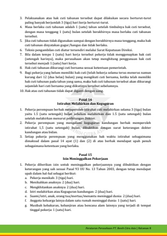 Peraturan Perusahaan PT. Benih Citra Asia| Halaman 83.Pelaksanakan atas hak cuti tahunan tersebut dapat dilakukan secara berturut-turut paling banyak berjumlah 3 (tiga) hari kerja berturut-turut.4.Masa berlaku cuti tahunan adalah 1 (satu) tahun setelah timbulnya hak cuti tersebut, dengan masa tenggang 1 (satu) bulan setelah berakhirnya masa berlaku cuti tahunan tersebut.5.Jikacuti tahunan tidak digunakan sampai dengan berakhirnya masa tenggang, maka hak cuti tahunan dinyatakan gugur/hangusdan tidak berlaku.6.Teknis pengambilan cuti diatur tersendiri melalui Surat Keputusan Direksi.7.Bila dalam tempo 1 (satu) hari kerja tersebutpekerja tidak menggenapkan hak cuti (setengah harinya), maka perusahaanakan tetap menghitung penggunaan hak cuti tersebut menjadi 1 (satu) hari kerja.8.Hak cuti tahunan dikurangi cuti bersama sesuai ketentuan pemerintah.9.Bagi pekerja yang belum memiliki hak cuti (telah bekerja selama terus-menerus namun kurang dari 12 (dua belas) bulan) yang mengikuti cuti bersama, ketika telah memiliki hak cuti tahunan pada tahun yang sama, maka hak cuti tahunan tersebut akan dikurangi sejumlah hari cuti bersama yang diikutinya tersebut sebelumnya. 10.Hak atas cuti tahunan tidak dapat diganti dengan uang.Pasal 14Istirahat Melahirkan danKeguguran1.Pekerja perempuan berhak memperoleh istirahat cuti melahirkan selama 3 (tiga) bulan yaitu 1.5(satu setengah)bulan sebelum melahirkan dan 1.5 (satu setengah) bulan setelah melahirkan menurut perhitungan Dokter.2.Pekerja perempuan yang mengalami keguguran kandungan berhak memperoleh istirahat 1,5 (satu setengah) bulan, dibuktikan dengan surat keterangan dokter kandungan atau bidan.3.Setiap pekerja perempuan yang menggunakan hak waktu istirahat sebagaimana dimaksud dalam pasal 14 ayat (1) dan (2) diatas berhak mendapat upah penuh sebagaimana ketentuan yang berlaku.Pasal 15Izin Meninggalkan Pekerjaan1.Pekerja diberikan izin untuk meninggalkan pekerjaannya yang dibuktikan dengan keterangan yang sah sesuai Pasal 93 UU No. 13 Tahun 2003, dengan tetap mendapat upah dalam hal-hal sebagai berikut:a.Pekerja menikah:3 (tiga) hari.b.Menikahkan anaknya: 2 (dua) hari.c.Mengkhitankan anaknya: 2 (dua) hari.d.Istri melahirkan atau Keguguran kandungan: 2 (dua) hari.e.Suami/istri, anak, orang tua/mertua/menantu meninggal dunia:2 (dua) hari.f.Anggota keluarga lainya dalam satu rumah meninggal dunia: 1 (satu) hari.g.Musibah kebakaran, kebanjiran atau bencana alam lainnya yang terjadi ditempat tinggal pekerja: 1 (satu) hari.