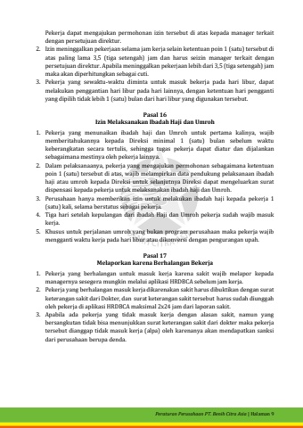 Peraturan Perusahaan PT. Benih Citra Asia| Halaman 9Pekerja dapat mengajukan permohonan izin tersebut diatas kepada manager terkait dengan persetujuan direktur.2.Izin meninggalkan pekerjaan selama jam kerja selain ketentuan poin1 (satu) tersebut diatas paling lama3,5(tiga setengah)jam dan harus seizinmanager terkait dengan persetujuan direktur.Apabila meninggalkan pekerjaan lebih dari 3,5 (tiga setengah) jam maka akan diperhitungkan sebagai cuti.3.Pekerja yang sewaktu-waktu diminta untuk masuk bekerja pada hari libur, dapat melakukan penggantian hari libur pada hari lainnya, dengan ketentuan hari pengganti yang dipilih tidak lebih 1 (satu) bulan dari hari libur yang digunakan tersebut.Pasal 16Izin Melaksanakan Ibadah Haji danUmroh1.Pekerja yang menunaikan ibadah haji dan Umroh untuk pertama kalinya,wajib memberitahukannya kepada Direksi minimal 1 (satu) bulan sebelum waktu keberangkatan secara tertulis, sehingga tugas pekerja dapat diatur dan dijalankan sebagaimana mestinya oleh pekerja lainnya.2.Dalam pelaksanaanya, pekerja yang mengajukan permohonan sebagaimana ketentuan poin 1(satu)tersebut diatas, wajib melampirkan data pendukung pelaksanaan ibadah haji atau umroh kepada Direksi untuk selanjutnya Direksi dapat mengeluarkan surat dispensasi kepada pekerja untuk melaksanakan ibadah haji dan Umroh.3.Perusahaan hanya memberikan izin untuk melakukan ibadah haji kepada pekerja 1 (satu) kali, selama berstatus sebagai pekerja.4.Tigahari setelah kepulangan dari ibadah Haji danUmroh pekerja sudah wajib masuk kerja.5.Khusus untuk perjalanan umroh yang bukan program perusahaan maka pekerja wajib mengganti waktu kerja pada hari libur atau dikonversi dengan pengurangan upah.Pasal 17Melaporkan karena Berhalangan Bekerja1.Pekerja yang berhalangan untuk masuk kerja karena sakit wajib melapor kepada managernya sesegera mungkin melalui aplikasi HRDBCA sebelum jam kerja.2.Pekerja yang berhalangan masuk kerja dikarenakan sakit harus dibuktikan dengan surat keterangan sakit dari Dokter, dan surat keterangan sakit tersebut harus sudah diunggah oleh pekerja di aplikasi HRDBCA maksimal 2x24 jam dari laporan sakit.3.Apabila ada pekerja yang tidak masuk kerja dengan alasan sakit, namun yang bersangkutan tidak bisa menunjukkan surat keterangan sakit daridokter maka pekerja tersebut dianggap tidak masuk kerja (alpa) oleh karenanya akan mendapatkan sanksi dari perusahaanberupa denda.