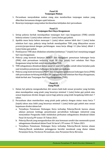 Peraturan Perusahaan PT. Benih Citra Asia| Halaman 11Pasal 20Tunjangan Makan1.Perusahaan menyediakan makan siang atau memberikan tunjungan makan yangdiberikan bersamaan dengan upah bulanan.2.Besarnya tunjungan uang makan berdasarkan kebijakan dari perusahaan.Pasal 21Tunjangan Hari Raya Keagamaan1.Setiap pekerja berhak mendapatkan tunjungan hari raya keagamaan (THR) setelah bekerja selama 1 (satu) tahun sebesar 1 (satu) bulan gaji pokok.2.Apabila masa kerja belum mencapai 1 (satu) tahun namun lebih dari 1 (satu) bulan sebelum hari raya, pekerja tetap berhak mendapatkan THR yang dibayarkan secara prorate/proporsional dengan perhitungan: masa kerjadibagi 12 (dua belas)dikali1 (satu) bulan gaji pokok.3.Pembayaran THR akan dilakukan selambat-lambatnya7 (tujuh) hari menjelang tanggal hari raya keagamaan.4.Pekerjayang kontrak kerjanya PKWTT dan mengalami pemutusan hubungan kerja (PHK)oleh perusahaan terhitung sejak 30 (tiga puluh) hari sebelum Hari Raya Keagamaantetap berhak untuk mendapatkan THR.5.THR sebagaimana dimaksud dalam pasal 21 ayat (4) berlaku untuk tahun berjalan pada saat terjadinya pemutusan hubungan kerja oleh perusahaan.6.Pekerjayangkontrak kerjanya PKWT dan mengalami pemutusan hubungan kerja (PHK) oleh perusahaan terhitung lebih dari 30 (tiga puluh) hari sebelum Hari Raya Keagamaan, tidak berhak atas Tunjangan Hari Raya keagamaan (THR).Pasal 22Uang Pisah1.Dalam hal pekerja mengundurkan diri secara baik-baik sesuai prosedur yang berlaku akan mendapatkan uang pisah yang besarnya minimal 1 (satu) bulan gaji pokok atau sesuai keputusan direksi dengan syarat bagi pekerja yang telah bergabung lebih dari 7 tahun.2.Perusahaan akan memberikan uang pisah pada pekerja dengan status masa kerja 7 (tujuh) tahun atau lebihyang besarnya minimal 1 (satu) bulan gaji pokok atau sesuai keputusan direksi dalam hal:a.Terjadinya Pemutusan Hubungan Kerja terhadap Pekerja/Buruh karena alasan adanya putusan lembaga penyelesaian perselisihan hubungan industrial yang menyatakan Pengusaha tidak melakukan perbuatan sebagaimana dimaksud dalam Pasal 36 huruf g PP nomor 35 Tahun 2021.b.Pekerja/Buruh yang mengundurkan diri atas kemauan sendiri dan memenuhi syarat sebagaimana dimaksud dalam Pasal 36 huruf i, PP nomor 35 Tahun 2021.c.Terjadinya Pemutusan Hubungan Kerja terhadap Pekerja/Buruh karena alasan Pekerja/Buruh melakukan pelanggaran bersifat mendesak yang diatur dalam Perjanjian Kerja, Peraturan Perusahaan, atau Perjanjian Kerja Bersama.
