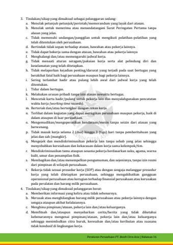 Peraturan Perusahaan PT. Benih Citra Asia| Halaman 163.Tindakan/sikap yang dimaksud sebagai pelanggaran sedang:a.Menolak petunjuk-petunjuk/perintah/memorandum yang layak dari atasan.b.Menolak untuk menerima atau menandatangani Surat Peringatan Pertama tanpa alasan yang jelas.c.Tidak memenuhi undangan/panggilan untuk mengikuti pelatihan-pelatihan yang telah ditentukan oleh perusahaan.d.Bertindak tidak sopan terhadap atasan, bawahan atau pekerja lainnya.e.Tidak dapat bekerja sama dengan atasan, bawahan atau pekerja lainnya f.Menghalangi dan/atau memengaruhi jadwal kerja.g.Tidak menaati aturan seragam/pakaian kerja serta alat pelindung diri dan keselamatan yang telah ditetapkan.h.Tidak melaporkan kejadian penting/darurat yang terjadi pada saat bertugas yang berakibat fatal baik bagi perusahaan maupun bagi pekerja lainnya.i.Sering terlambat hadir atau pulang lebih awal dari jadwal kerja yang telah ditentukan.j.Tidur dalam bertugas.k.Melakukan urusan pribadi tanpa izin atasan sewaktu bertugas.l.Mencetak kartu hadir/pulang untuk pekerja lain dan menyalahgunakan pencatatan waktu kerja (working time records).m.Berteriak dan/atau bertengkar dengan rekan kerja.n.Terlibat dalam kegiatan yang dapat merugikan perusahaan maupun pekerja, baik di dalam ataupun di luar perusahaan.o.Mengemudikan/mengoperasikan kendaraan/mesin tanpa seizin dari atasan yang berwenang.p.Tidak masuk kerja selama 2 (dua) hingga 3 (tiga) haritanpa pemberitahuan yang jelas dan sah (mangkir).q.Mengejek dan mendiskriminasikan pekerja lain tanpa sebab yang jelas sehingga menyebabkan keresahaan dan kekacauan dalam kerja sama kelompok/tim.r.Mendiskriminasikan tamu ataupun sesama pekerja berdasarkan suku, agama, warnakulit, umur dan penampilan fisik.s.Membagikan dan/atau menempelkan pengumuman, dan sejenisnya, tanpa izin resmi dari pimpinan di wilayah perusahaan.t.Bekerja tidak sesuai prosedur kerja (SOP) atau dengan sengaja melanggar prosedur kerja yang telah ditetapkan perusahaan, sehingga mengakibatkan gangguan operasional perusahaan atau kerugian terhadap finansial perusahaan atau kerusakan pada peralatan dan barang milik perusahaan.4.Tindakan/sikap yang dimaksud pelanggaran berat:a.Memberikan informasi yang keliru atau tidak sebenarnya.b.Merusak atau menghilangkan barang milik perusahaan atau pekerja lainnya dengan sengaja ataupun akibat kelalaiannya.c.Menghina pimpinan/atasan, pekerja lain dan/atau keluarganya.d.Memfitnah dan/ataupun menyebarkan cerita/berita yang tidak diketahui kebenarannya mengenai pimpinan/atasan, pekerja lain dan/atau keluarganya sehingga menimbulkan citra buruk, keresahandan/atau keributan atau suasana tidak kondusif di lingkungan kerja.