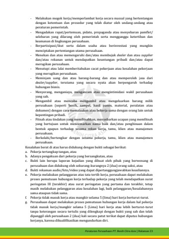Peraturan Perusahaan PT. Benih Citra Asia| Halaman 23-Melakukan mogok kerja/memperlambat kerja secara massal yang bertentangan dengan ketentuan dan prosedur yang telah diatur oleh undang-undang atau peraturan pemerintah.-Mengadakan rapat/pertemuan, pidato, propaganda atau menyebaran pamflet/selebaran yang dilarang oleh pemerintah serta mengganggu ketertiban dan keamanan di lingkungan perusahaan.-Berpartisipasi/ikut serta dalam usaha atau berinvestasi yang mungkin menciptakan pertentangan utama perusahaan.-Menekan dan atau memengaruhi dan/atau membujuk dealerdan atau supplierdan/atau rekanan untuk mendapatkan keuntungan pribadi dan/atau dapat merugikan perusahaan.-Menutupi atau lalai memberitahukan cacat pekerjaan atau kesalahan pekerjaan yang merugikan perusahaan.-Meminjam uang dan atau barang-barang dan atau memperoleh jasa dari dealer/supplier, terutama yang secara nyata akan berpengaruh terhadap hubungan bisnis.-Menyerang, menganiaya, mengancam atau mengintimidasi wakil perusahaan yang sah. -Mengambil atau mencoba mengambil atau mengeluarkan barang milik perusahaan (seperti benih, sampel, hasil panen, material, peralatan atau dokumen) dengan cara memalsukan atau bekerja sama dengan orang lain untuk kepentingan pribadi.-Fitnah atau tindakan yang memfitnahkan,menyebarkan ucapan yang memfitnah yang bertujuan untuk mencemarkan nama baik dan/atau penghinaandalam bentuk apapunterhadap sesama rekan kerja, tamu, klien atau manajemen perusahaan. -Berkelahi/bertengkardengan sesama pekerja, tamu, klien atau manajemen perusahaan.Kesalahan berat diatas harus didukung dengan bukti sebagai berikut:a.Pekerja tertangkap tangan, ataub.Adanya pengakuan dari pekerja yang bersangkutan, atauc.Bukti lain berupa laporan kejadian yang dibuat oleh pihak yang berwenang di perusahaan dan didukung oleh sekurang-kurangnya 2 (dua) orangsaksi, ataud.Bukti rekaman audio/foto/video yang dapat dipertanggungjawabkan keasliannya.e.Pekerja melakukan pelanggaran atas tata tertib kerja, perusahaan dapat melakukan proses pemutusan hubungan kerja terhadap pekerja yang telah mendapatkan surat peringatan III (terakhir) atau surat peringatan yang pertama dan terakhir, tetap masih melakukan pelanggaran atau kesalahan lagi, baik pelanggaran/kesalahannya sama ataupun tidak sama.f.Pekerja tidak masuk kerja atau mangkir selama 5 (lima) hari kerja berturut-turut.g.Perusahaan dapat melakukan proses pemutusan hubungan kerja dalam hal pekerja tidak masuk kerja/mangkir selama 5 (Lima) hari kerja atau lebih berturut-turut tanpa keterangan secara tertulis yang dilengkapi dengan bukti yang sah dan telah dipanggil oleh perusahaan 2 (dua) kali secara patut terikat dapat diputus hubungan kerjanya, karena dikualifikasikan mengundurkan diri.