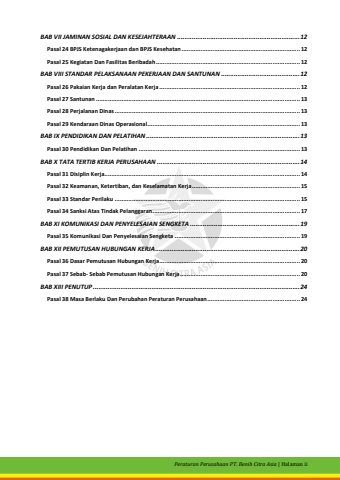 Peraturan Perusahaan PT. Benih Citra Asia| Halaman iiBAB VII JAMINAN SOSIAL DAN KESEJAHTERAAN...................................................................12Pasal 24 BPJS Ketenagakerjaan dan BPJS Kesehatan.....................................................................12Pasal 25 Kegiatan Dan Fasilitas Beribadah....................................................................................12BAB VIII STANDAR PELAKSANAAN PEKERJAAN DAN SANTUNAN...........................................12Pasal 26 Pakaian Kerja dan Peralatan Kerja..................................................................................12Pasal 27 Santunan.......................................................................................................................13Pasal 28 Perjalanan Dinas............................................................................................................13Pasal 29 Kendaraan Dinas Operasional.........................................................................................13BAB IX PENDIDIKAN DAN PELATIHAN....................................................................................13Pasal 30 Pendidikan Dan Pelatihan..............................................................................................13BAB X TATA TERTIB KERJA PERUSAHAAN..............................................................................14Pasal 31 Disiplin Kerja..................................................................................................................14Pasal 32 Keamanan, Ketertiban, dan Keselamatan Kerja...............................................................15Pasal 33 Standar Perilaku............................................................................................................15Pasal 34 Sanksi Atas Tindak Pelanggaran......................................................................................17BAB XI KOMUNIKASI DAN PENYELESAIAN SENGKETA............................................................19Pasal 35 Komunikasi Dan Penyelesaian Sengketa.........................................................................19BAB XII PEMUTUSAN HUBUNGAN KERJA...............................................................................20Pasal 36 Dasar Pemutusan Hubungan Kerja..................................................................................20Pasal 37 Sebab-Sebab Pemutusan Hubungan Kerja......................................................................20BAB XIII PENUTUP.................................................................................................................24Pasal 38 Masa Berlaku Dan Perubahan Peraturan Perusahaan......................................................24