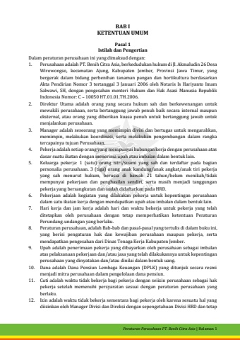 Peraturan Perusahaan PT. Benih Citra Asia| Halaman 1BAB IKETENTUAN UMUMPasal 1Istilah dan PengertianDalam peraturan perusahaan ini yang dimaksud dengan: 1.Perusahaan adalah PT. Benih Citra Asia, berkedudukan hukum di Jl. Akmaludin 26 Desa Wirowongso, kecamatan Ajung, Kabupaten Jember, Provinsi Jawa Timur, yang bergerak dalam bidang perbenihan tanaman pangan dan hortikultura berdasarkan AktaPendirianNomor3 tertanggal 3 Januari2006oleh NotarisIsHariyanto Imam Salwawi, SH, dengan pengesahan menteriHukum dan Hak Asasi Manusia Republik Indonesia Nomor: C %u201310050 HT.01.01.TH.2006. 2.Direktur Utama adalah orang yangsecara hukum sahdan berkewenanganuntukmewakili perusahaan, serta bertanggung jawab penuh baik secara internal maupun eksternal, atau orang yang diberikan kuasa penuhuntuk bertanggung jawab untuk menjalankan perusahaan.3.Manager adalah seseorang yang memimpin divisi dan bertugas untuk mengarahkan, memimpin, melakukan koordinasi, serta melakukan pengembangan dalam rangka tercapainya tujuan Perusahaan.4.Pekerja adalah setiap orang yang mempunyai hubungan kerja dengan perusahaan atas dasar suatu ikatan dengan menerima upah atau imbalan dalam bentuk lain. 5.Keluarga pekerja: 1 (satu) orang istri/suami yang sah dan terdaftar pada bagian personalia perusahaan. 3 (tiga) orang anak kandung/anak angkat/anak tiri pekerja yang sah menurut hukum, berusia dibawah 21 tahun/belum menikah/tidak mempunyai pekerjaan dan penghasilan sendiri, serta masih menjadi tanggungan pekerja yang bersangkutan dan sudah didaftarkan pada HRD.6.Pekerjaan adalah kegiatan yang dilakukan pekerja untuk kepentingan perusahaan dalam satu ikatan kerja dengan mendapatkan upah atau imbalan dalam bentuk lain.7.Hari kerja dan jam kerja adalahharidan waktu bekerja untuk pekerja yang telah ditetapkan oleh perusahaan dengan tetap memperhatikan ketentuan Peraturan Perundang-undangan yang berlaku.8.Peraturan perusahaan, adalah Bab-bab dan pasal-pasal yang tertulis didalam buku ini, yang berisi pengaturan hak dan kewajiban perusahaan maupun pekerja, serta mendapatkan pengesahan dari Dinas Tenaga KerjaKabupaten Jember.9.Upah adalah penerimaan pekerja yang dibayarkan oleh perusahaan sebagai imbalan atas pelaksanaan pekerjaan dan/atau jasa yang telah dilakukannya untuk kepentingan perusahaan yangdinyatakan dan/atau dinilai dalam bentuk uang.10.Dana adalah Dana Pensiun Lembaga Keuangan (DPLK) yang ditunjuk secara resmi menjadi mitra perusahaan dalam pengelolaan dana pensiun.11.Cuti adalah waktu tidak bekerja bagi pekerja dengan seiizin perusahaan sebagai hak pekerja setelah memenuhi persyaratan sesuai dengan peraturan perusahaan yang berlaku.12.Izin adalah waktu tidak bekerja sementara bagi pekerja oleh karena sesuatu hal yang diizinkan oleh Manager Divisi dan Direksi dengan sepengetahuan Divisi HRD dan tetap
