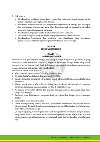 Peraturan Perusahaan PT. Benih Citra Asia| Halaman 42.Hak pekerja:a.Mendapatkan kejelasan status kerja, tugas dan pekerjaan sesuai dengan posisi pekerja yang telah ditetapkan oleh Direksi.b.Mendapatkan imbalan/balas jasa yang layak dari perusahaan, berupa gaji, tunjangan dan pendapatan lain yang sah, yang telah ditetapkanoleh perusahaan berdasarkan jenis pekerjaan dan tanggung jawabnya. c.Mendapatkan kejelasan waktu dan hari istirahat kerja serta cuti.d.Diikutsertakan pada program BPJS Ketenagakerjaan dan BPJS Kesehatan.e.Mendapatkan bimbingan dan pelatihan yang diperlukanguna menunjang pekerjaannya, serta meningkatkan produktivitas dan efisiensi kerja.BAB IIIHUBUNGANKERJAPasal 5Penerimaan PekerjaPenerimaan dan penempatan pekerja adalah sepenuhnya menjadi hak perusahaan yang didasarkan pada kebutuhan dan/atau anggaran kebutuhan tenaga kerja yang sudah direncanakan dan disetujui oleh Direksi, dengan tetap memperhatikan ketentuan-ketentuan tentang peraturan ketenagakerjaan yang berlaku.Persyaratan umum calon pekerja:a.Warga Negara Indonesia dan/atau Warga Negara Asingb.Memiliki Kartu Tanda Penduduk yang masih berlaku.c.Berusia sekurang-kurangnya 18 (delapan belas) tahun dibuktikandengan kartu tanda penduduk.d.Khusus untuk pekerja Warga Negara Asing batas minimum usia mengikuti ketentuan peraturan perundang-undangan yang berlaku dinegara tersebut.e.Memenuhi persyaratan jabatan dan memiliki kemampuan bekerja sesuai bidangkerja yang akan ditempati.f.Berbadan sehat, baik jasmani maupun rohani yang dibuktikan dengan surat keterangan dokter.g.Lulus dalam tahap seleksi dan tes.h.Untuk bidangbidang pekerja tertentu, perusahaan menambah persyaratan khusus lainnya, sesuai dengan kebutuhan, tuntutan dan/atauspesifikasi pekerjaan/jabatan yang akan ditempati calon pekerja.i.Calon pekerja yang memiliki pertalian darah atau pertalian pernikahan dengan pekerja yang sudah bekerja didalam perusahaan dimungkinkan untuk menjadi pekerja, dan penerimaannya harus berdasarkan persetujuan Direksi dan berdasarkan prosedur yang ada.